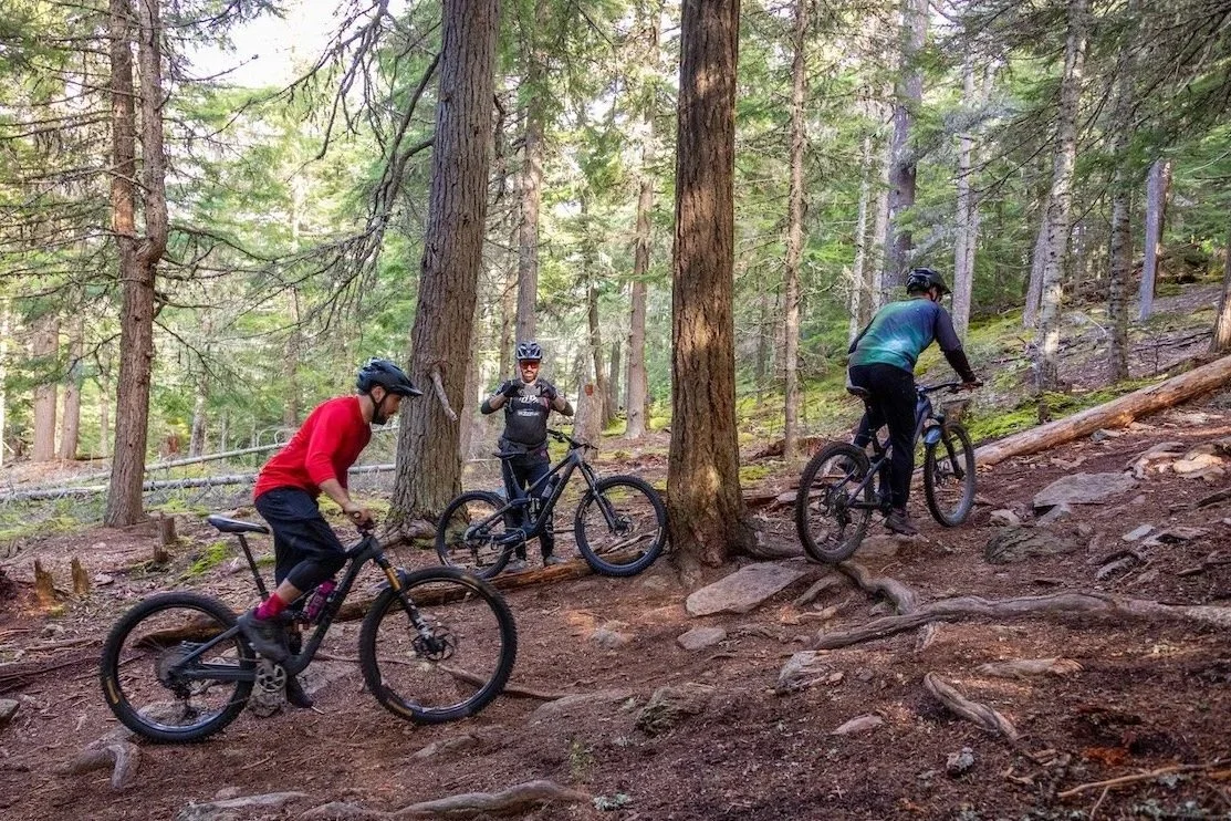 Focus on core tech skills—body position, brake control, and terrain awareness—while progressing through steep, rooty, and rocky terrain to build confidence and control.